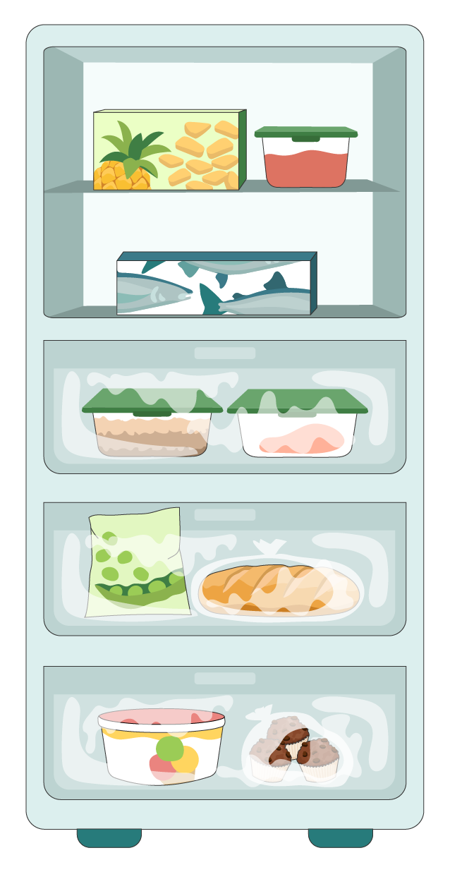 Exempel på mat som går att frysa in är kött, fisk, mjölk, grädde, ost, frukt, bär, grönsaker, såser, sylt och mjukt bröd.