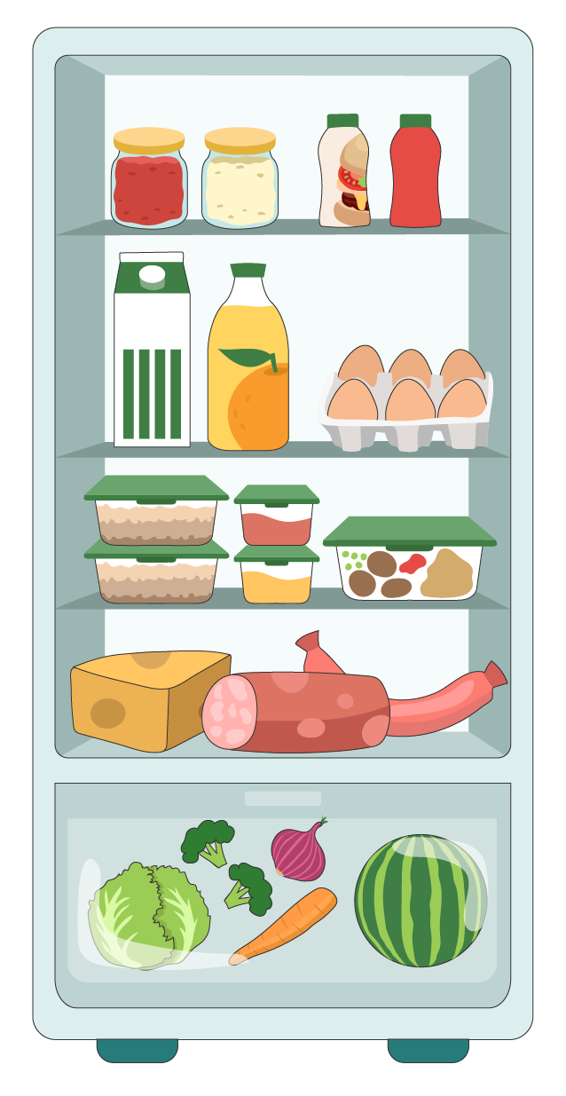 De flesta grönsaker och frukter ska förvaras i kylskåpet, gärna i grönsakslådan om det finns en sådan. Till exempel blomkål, kål, lök, vitlök, morot, rödbeta och purjolök. Även äpple, apelsin, päron, vindruvor och melon bör förvaras i kylskåpet. Men om man vet att de kommer att ätas upp snart kan de förvaras i rumstemperatur.