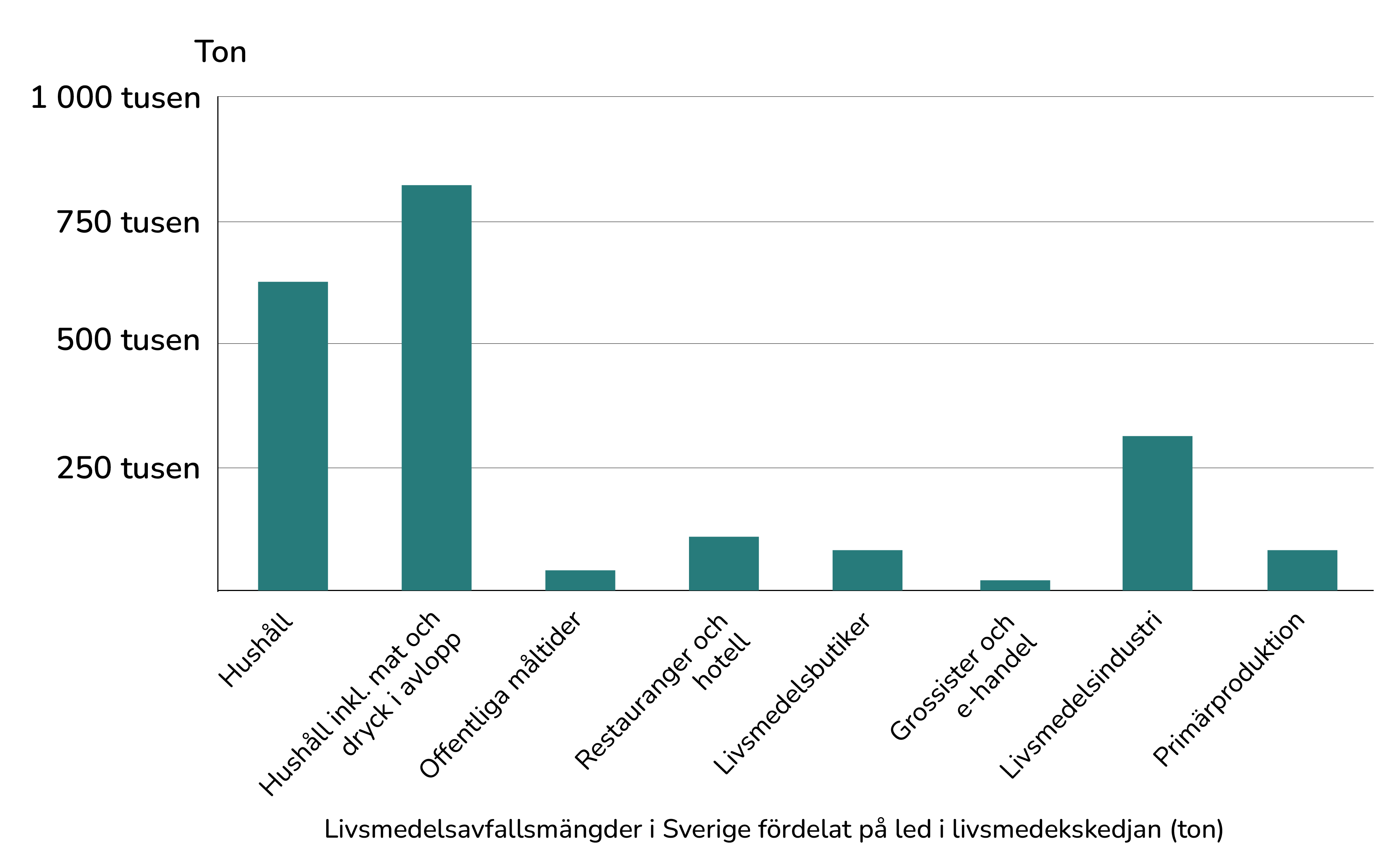Diagrammet ovan visar mängden matavfall i Sverige år 2023 fördelat över de olika delarna i livsmedelskedjan.