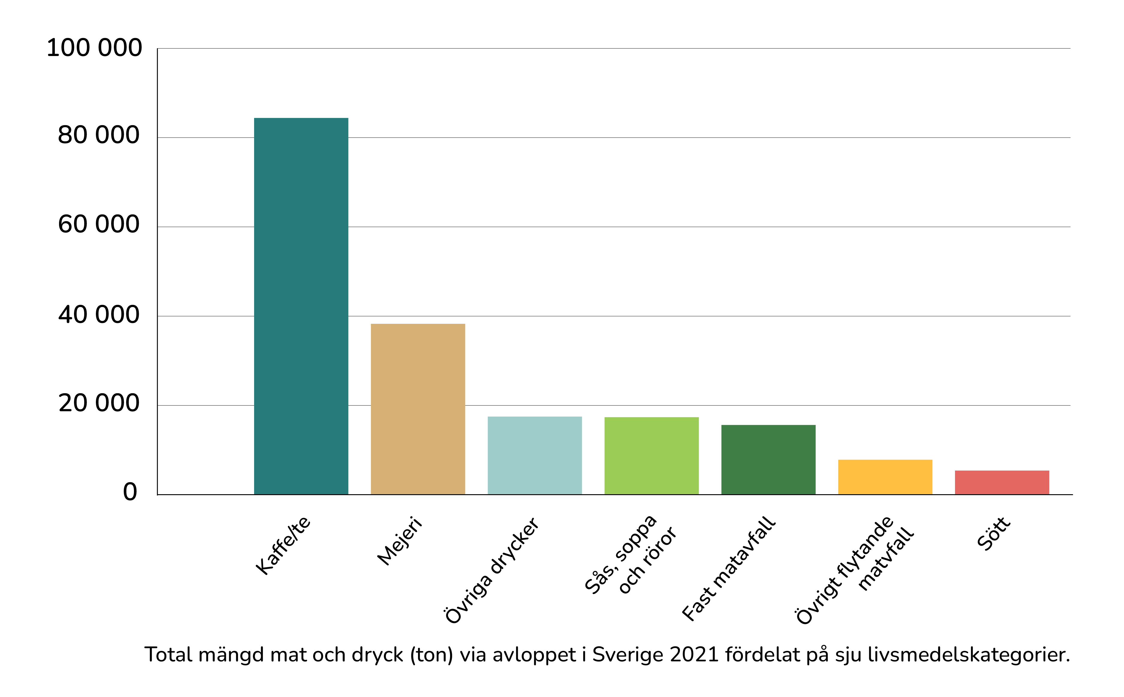 I Sverige slänger varje person i genomsnitt 34 kg fullt ätbar mat per år (2024). Av detta är 16 kg mat som antingen sorteras ut som matavfall eller slängs i restavfallet. Resterande 18 kg är mat och dryck som spolas ner i avloppet, antingen i vasken eller i toaletten.