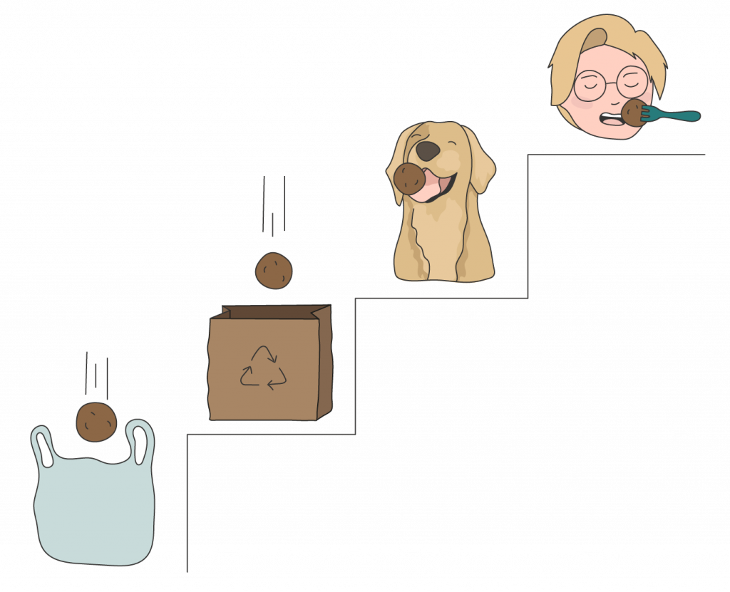 fortfarande är bättre att äta upp maten istället för att göra den till biogas. Visa en bild på avfallstrappan (se separat bildfil) för att förklara att det är bäst om vi befinner oss högtupp i trappan. Alternativt använd bilderna från bildkorten och rita en trappa på tavlan med munnen högst upp och soppåsen längst ner. Ju längre ner, desto större slöseri med energi och resurser.