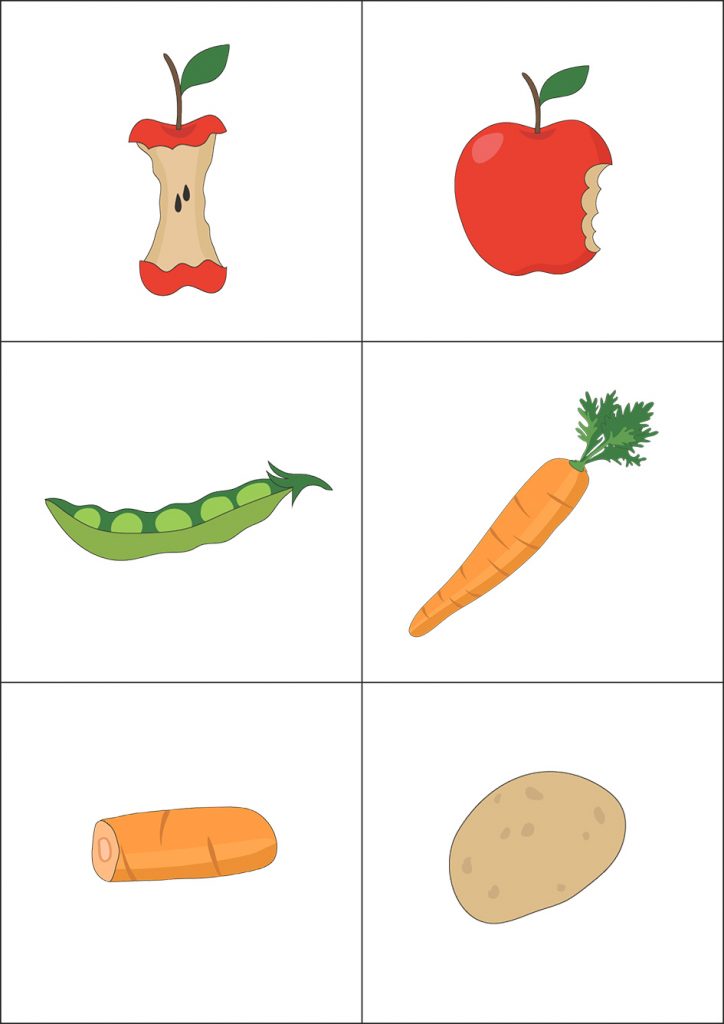 Dela ut de utskrivna bilderna på matvarorna till eleverna. De ska sedan i helklass sortera dessa bilder i de två kategorierna på tavlan/bordet. Vissa saker kan både hamna i munnen och i matavfallspåsen. I dessa fall kan ni tillsammans diskutera vad ni tycker är mest rätt svar (t.ex. var de väljer att lägga moroten med blast eller det hela äpplet). Det är bra om ni i samtalet får med att det bästa är om vi själva äter maten istället för att slänga den, även om det är bättre att slänga den i matavfallspåsen än i hushållssoporna (brännbart).