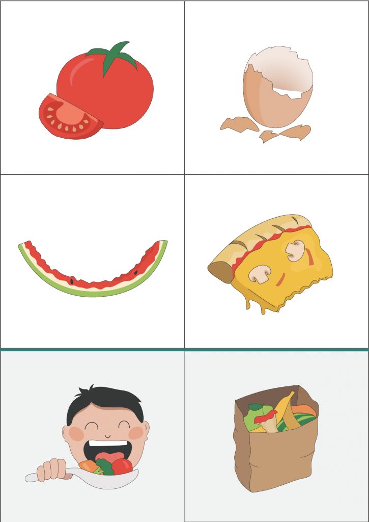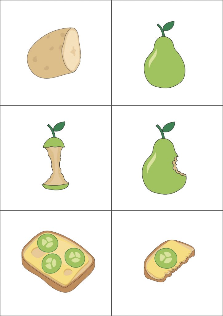 På arbetsbladet får eleverna träna mer på om sakerna bilderna visar ska ätas eller slängas i påsen för matavfall. På andra sidan ska de ringa in vad som är matsvinn. Innan denna uppgift görs, gå igenom noga vad det är för skillnad på matavfall och matsvinn.