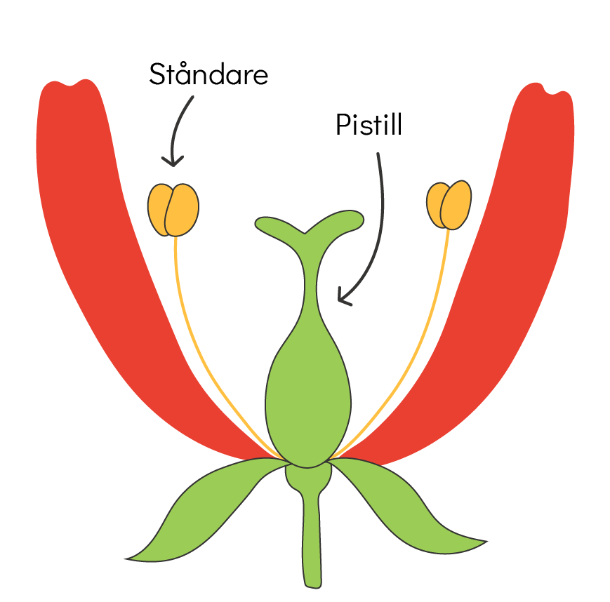 För att växter ska kunna föröka sig måste de pollineras. Pollinering innebär att pollenkorn från en ståndare hamnar på en pistill. Ståndare och pistiller är delar av en blomma, som du ser i bilden till höger. Pollenkornen kan flyttas med hjälp av vind eller vatten, men det mest effektiva för blommor är att ta hjälp av insekter, fåglar eller däggdjur.